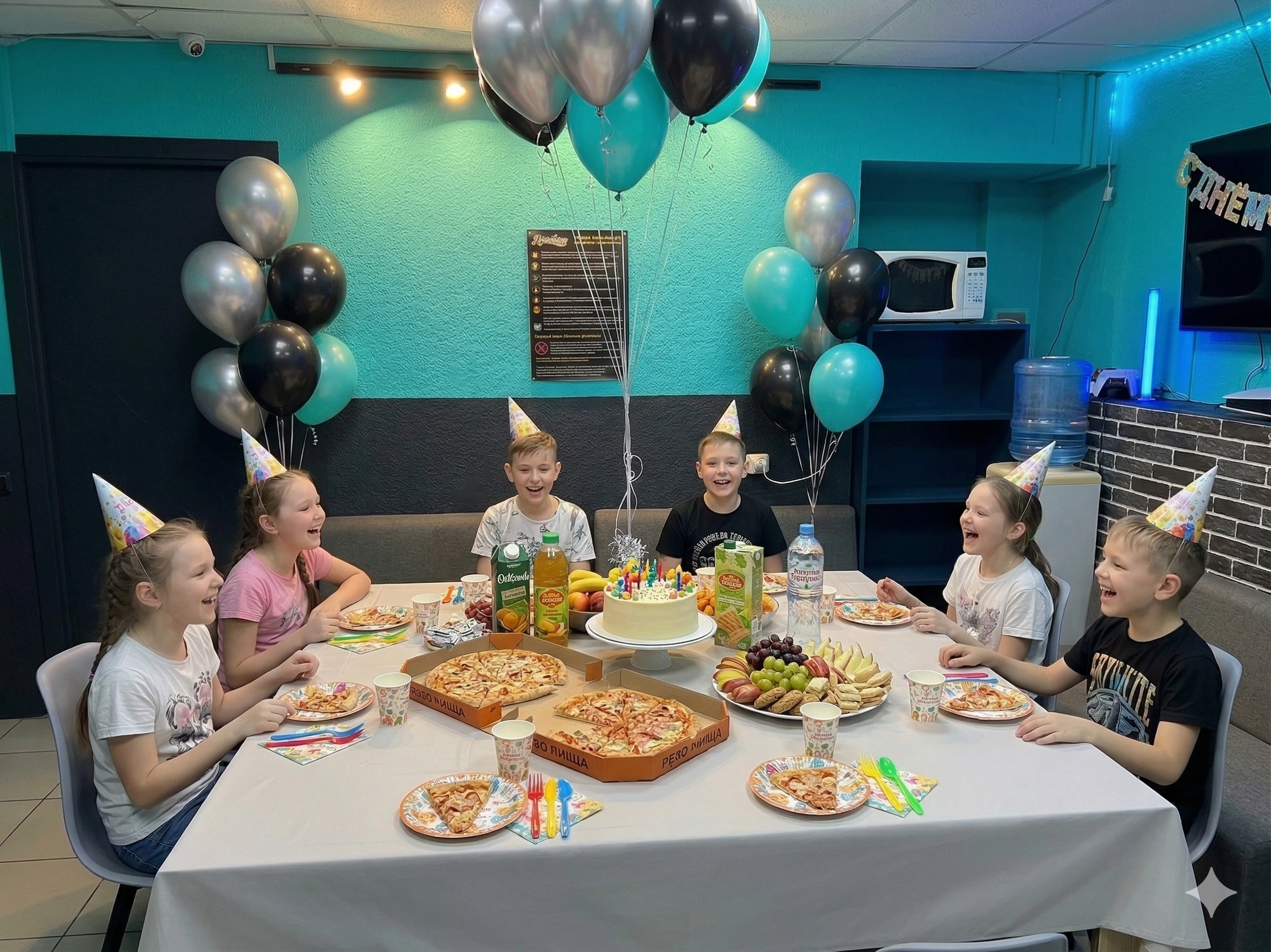 Вам не придётся искать кафе или помещение. У нас уже есть готовая развлекательная зона, а так же есть место для чаепития и праздничного стола. Никуда не придётся идти!